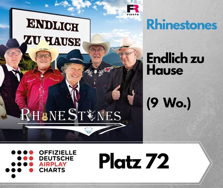 Die Cowboys der RHINESTONES sind mit ihrer Single "Endlich zu Hause" seit nunmehr neun Wochen in den Top 100 der deutschen Airplaycharts Konservativ Pop vertreten, diese Woche auf Platz 72.